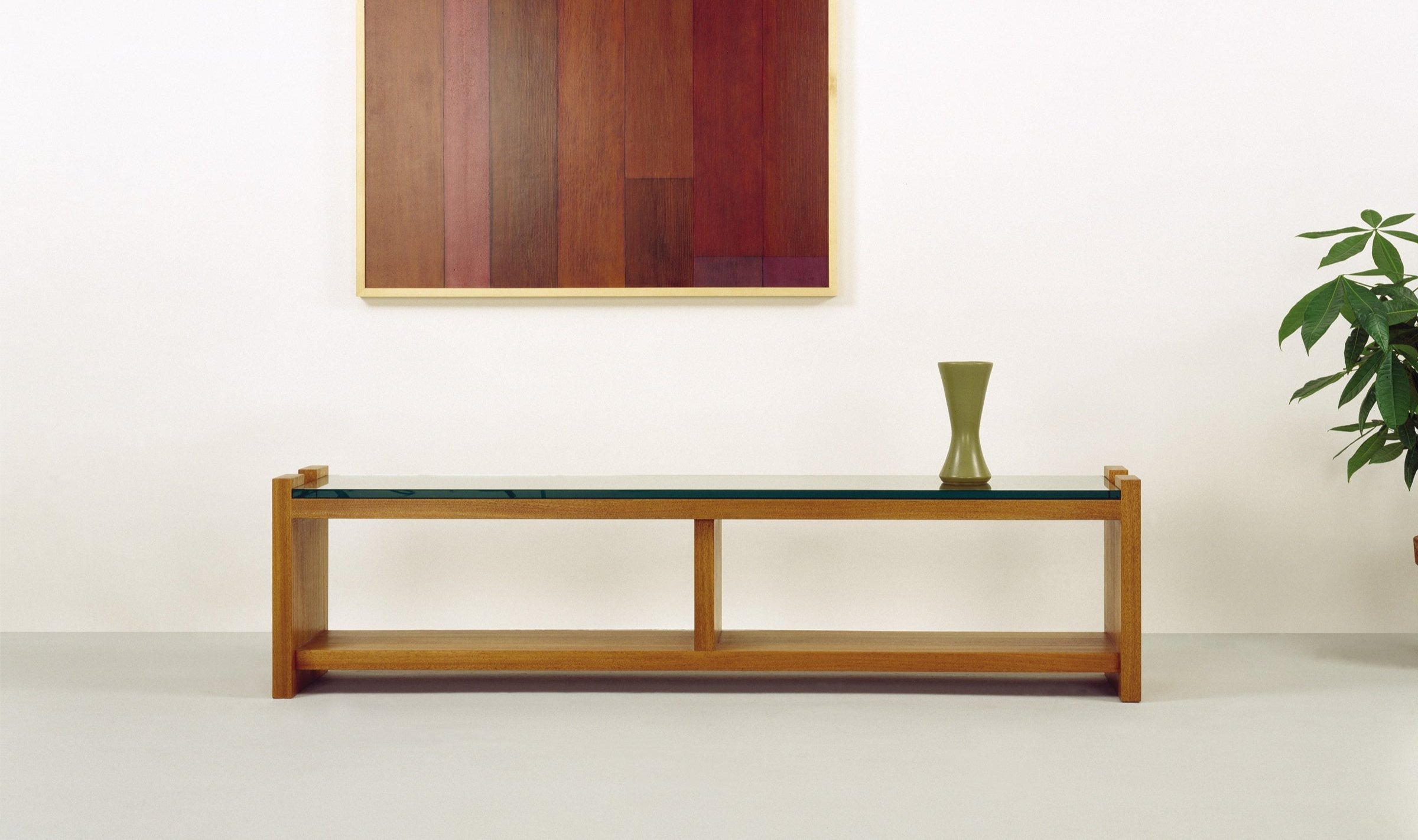 Solid wood with hand applied clear oil finish and glass top. *Units with additional glass tops available for delivery in Los Angeles only. We encourage glass tops be sourced at final destination for convenience and cost efficiency.