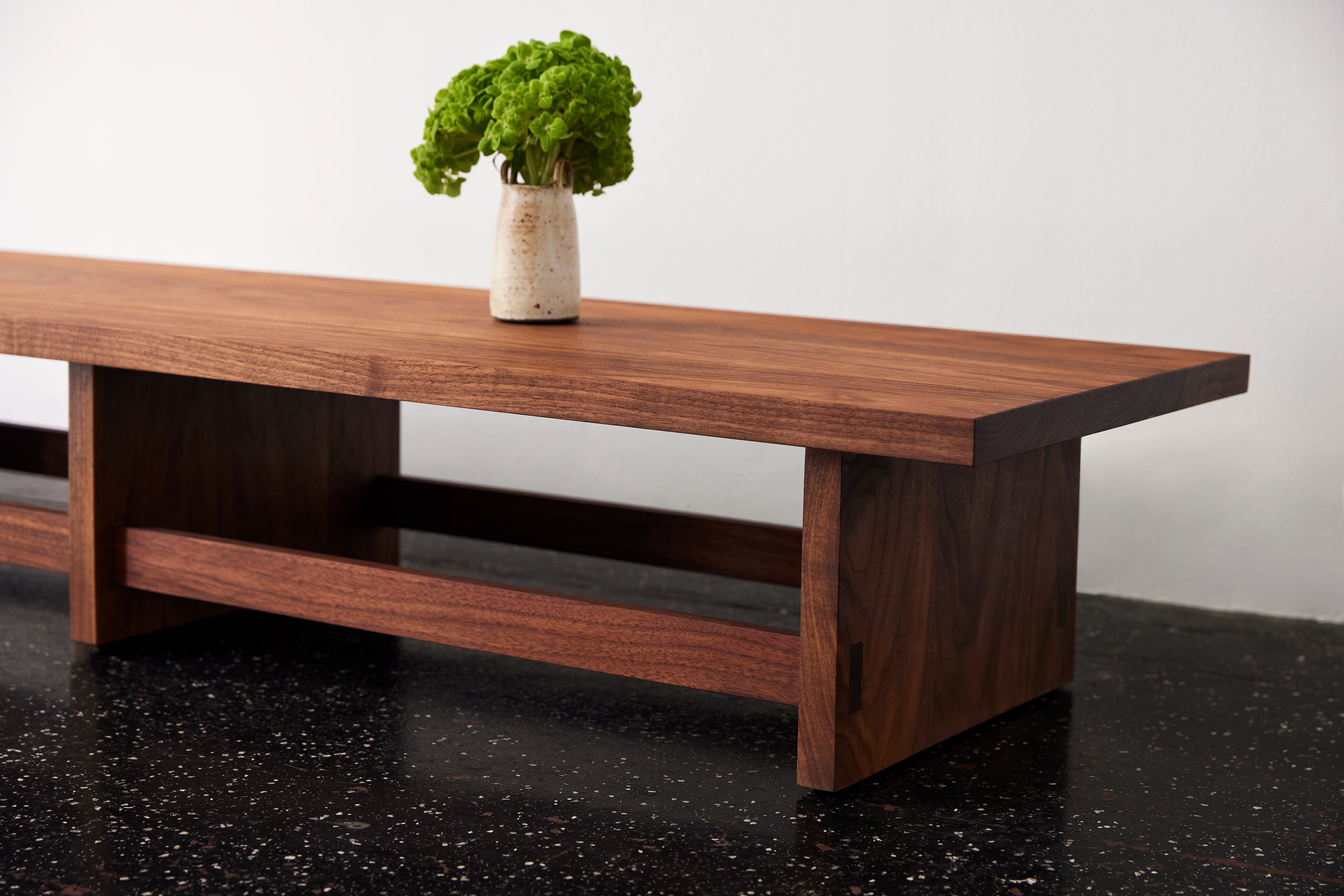 An exercise in simplicity, Stringer features a top and legs in minimally finished solid wood, while slender through tenon joinery reveals poetic details found below.